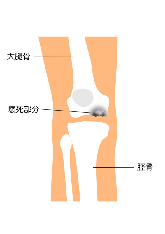 大腿骨顆部骨壊死(だいたいこつ かぶ こつえし)は、ひざ関節に接している大腿骨の先端(大腿骨顆部)の組織が壊死する病気です。エックス線、MRI(磁気共鳴画像)検査で壊死した部位を確認することができます。壊死した組織がつぶれてしまうと、骨の一部が陥没し、痛みが増し、下肢O脚変形が進行します。 大腿骨顆部骨壊死の原因は、未だ不明ですが、中高年以降、特に60歳以上の女性に多く見られ、夜間、安静時に急に強い痛みを感じるなどの症状がでます。発症直後には、レントゲン検査では異常が見つからないこともあり、見逃されることが多いので、MRI検査が診断にとても重要になります。また初期や進行期に関節内に注射をしても痛みはあまり軽減されません。病期が進行すると膝関節の変形が進み、変形性膝関節症へ移行することもあります。 大腿骨顆部骨壊死の主な症状 大腿骨顆部骨壊死の典型的な症状は以下の通りです。 突然の膝の激痛(特に歩行時) 夜間痛・安静時痛(じっとしていても痛む) 膝の腫れ・熱感 階段の昇降時の痛みや歩行困難 関節のこわばりや変形特に、痛みの発症が急激であることが特徴です。 発症初期は安静にしていれば痛みが軽減することもありますが、進行すると持続的な痛みが続きます。 症状の進み方 突然の痛みで発症することがあります。また痛みは非常に強いものです。歩行時はもちろんですが、寝ていても持続性の痛みを感じることもあります。 初期の激しい疼痛は、徐々に軽快して改善することもありますが、高齢者の方で骨が脆弱化(ぜいじゃくか)している場合は、骨の陥没破壊が進行し、関節軟骨も壊死するため変形性関節症になります。 症状が進行するに従いO脚変形が出現し、痛みは増強します。関節周辺が腫れ、関節水症(かんせつすいしょう)の様なひざに水がたまる症状が起こり、関節の動きが悪くなります。ひざ関節も段々とまっすぐに伸びなくなり、末期の変形性関節症となっていきます。 大腿骨顆部骨壊死の特徴 大腿骨顆部(だいたいこつ かぶ)とは、膝関節をつくる太ももの骨の先端部分のことです。この部分の骨に十分な血液が届かなくなるなどの理由で骨が弱くなり壊死してしまい、膝の痛み痛みが出る病気が大腿骨顆部骨壊死といいます。 原因がはっきりしない「特発性」の場合、膝の内側(内顆)に起こることが多いとされています。発症すると、歩行時や夜間安静している時などに突然の強い痛みを感じることが多く、時間とともに痛みが増していくこともあり日常生活に支障をきたすことがあります。早期診断と適切な治療を行わないと、膝関節の破壊が進み変形していきます。 場合によっては人工関節の手術が必要になるケースも少なくありません。 そのため、早期発見・早期治療がとても大切です。 大腿骨顆部骨壊死の主な特徴 中高年の女性に多くみられる 膝の内側(内顆)に起こりやすい 骨粗鬆症などによる疲労骨折や骨への血流不足で壊死が起こりやすい 大腿骨顆部骨壊死の原因とリスク因子 大腿骨顆部骨壊死(だいたいこつ かぶ こつえし)の原因は、前述いたしましたように、未だ完全には解明されていません。しかし、以下の要因が関係していると考えられています。 ①血流障害骨の栄養を供給する血流が不足すると、骨組織が壊死する可能性があります。加齢に伴い血管が狭くなることや、動脈硬化の進行がリスク因子となります。②軽微な骨折(疲労骨折)骨密度が低下すると、日常生活の動作でも骨に微細な骨折が生じやすくなります。これが壊死のきっかけとなることがあります。③骨粗鬆症加齢や女性ホルモンの減少によって骨が脆くなると、大腿骨の内側に大きな負担がかかりやすくなります。特に閉経後の女性はリスクが高いとされています。④ステロイドの長期使用自己免疫疾患や膠原病の治療でステロイドを長期間使用している場合、骨の血流が悪くなり、壊死を引き起こすことがあります。⑤変形性膝関節症との関連変形性膝関節症が進行すると、膝の負担が偏ることで局所的に骨壊死が起こることがあります。 大腿骨顆部骨壊死の診断 レントゲン(X線検査)初期段階ではレントゲンに異常が映らないことが多いですが、病期が進むと関節面の変形や骨壊死部分が確認できます。 MRI(磁気共鳴画像診断)最も有効な診断方法です。初期の段階でも骨壊死の範囲や周囲の炎症状態を詳細に評価できます。 骨シンチグラフィー骨の代謝状態を調べる検査で、壊死の範囲や血流障害の有無を確認できます。 大腿骨顆部骨壊死の病期分類(腰野分類) 大腿骨顆部骨壊死は、4つのステージ(病期)に分類されます。 病期診断方法特徴ステージ1:発症期MRIでのみ確認可能レントゲンでは変化なし。膝に強い痛みが出ることが多い。ステージ2:吸収期レントゲン・MRIで確認可能壊死部分が吸収され始め骨が透けて見えるようになる。ステージ3:完成期レントゲンで明瞭に確認可能骨硬化が進み石灰沈着が起こる。ステージ4:変性期関節の変形が進