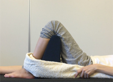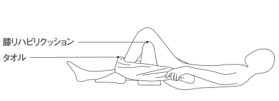 仰向けで、膝の裏にクッションを当てて膝を支え、タオルなどを足先にかけ、無理のない範囲で太ももの方向へゆっくり引き寄せ、膝を曲げていきます。