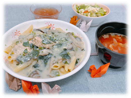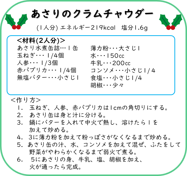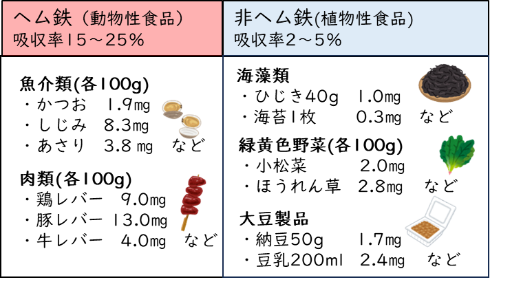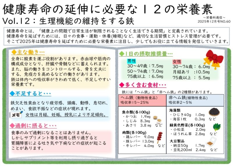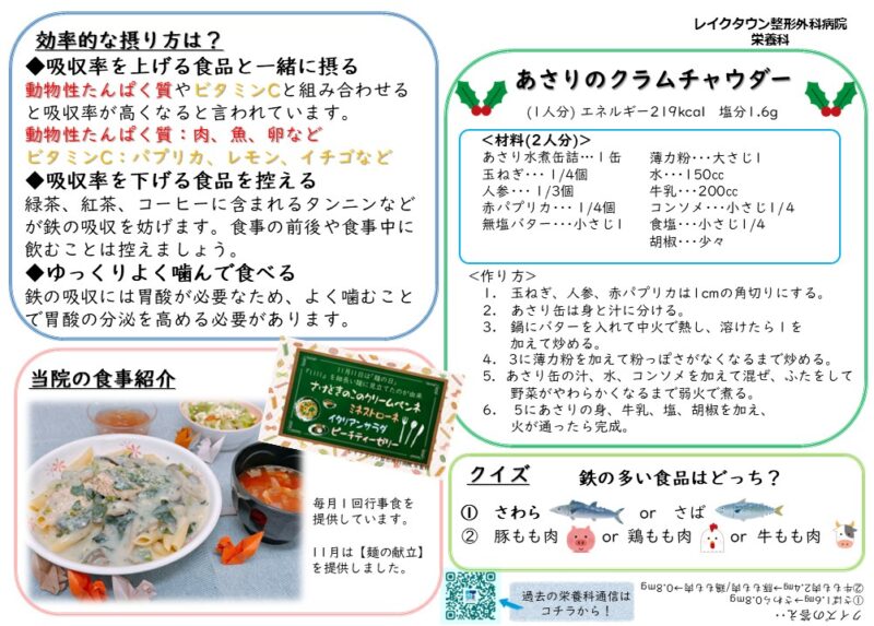*健康寿命の延伸に必要な12の栄養素* Vol.12:生理機能の維持をする鉄 健康寿命とは、「健康上の問題で日常生活が制限されることなく生活できる期間」と定義されています。健康寿命を延ばすためには、日々の食事・運動・休養(睡眠)など、適切な生活習慣とストレス管理が必要です。そこで2025年は健康寿命を延ばすために必要な栄養素に注目し、少しでもお役に立てる情報を発信していきます。 全身に酸素を運ぶ役割があります。赤血球や筋肉の構成成分となり、肝臓や骨髄などに蓄えられます。また、脳の働きをコントロールする、骨を丈夫にする、免疫力を高めるなどの働きがあります。鉄は体内への吸収率がきわめて低く、不足しやすい栄養素です。 鉄欠乏性貧血となり疲労感、頭痛、動悸、息切れ、めまい、食欲不振などの症状が現れます。 女性は月経、妊娠、授乳により不足傾向。 食事のみで過剰になることはありません。しかしサプリメント等を利用し摂り過ぎると胃腸障害による吐き気や下痢などの症状が起こる ことがあります。 鉄には「ヘム鉄」と「非ヘム鉄」の2種類があります。 *効率的な摂り方は?* ◆吸収率を上げる食品と一緒に摂る 動物性たんぱく質やビタミンCと組み合わせると吸収率が高くなると言われています。 動物性たんぱく質:肉、魚、卵など ビタミンC:パプリカ、レモン、イチゴなど ◆吸収率を下げる食品を控える 緑茶、紅茶、コーヒーに含まれるタンニンなどが鉄の吸収を妨げます。食事の前後や食事中に飲むことは控えましょう。 ◆ゆっくりよく噛んで食べる 鉄の吸収には胃酸が必要なため、よく噛むことで胃酸の分泌を高める必要があります。 *クイズ* 鉄の多い食品はどっち? お手軽レシピの紹介 当院の食事紹介 毎月1回行事食を提供しています。11月は【麺の献立】を提供しました。